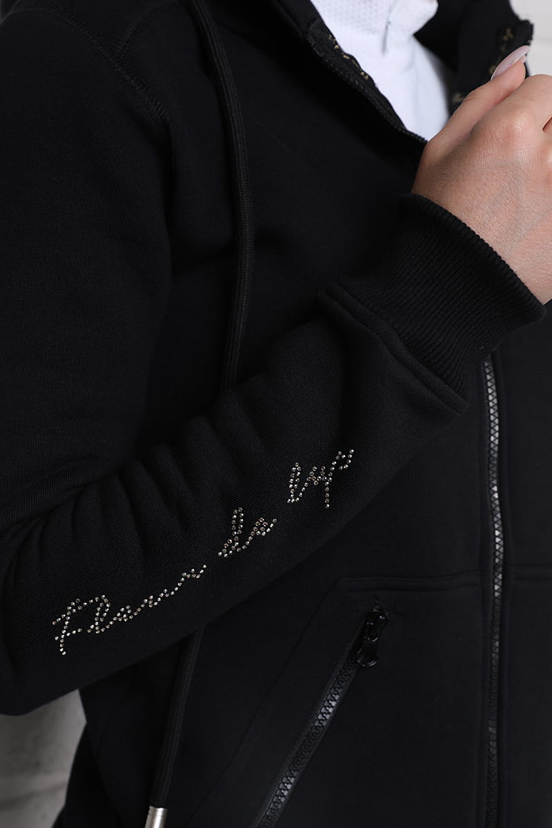 4.the sweatshirt has an elegant logo on the sleeve made of crystals and a discreet logo on the front. The entire garment is trimmed on the underside with elegant logo piping .