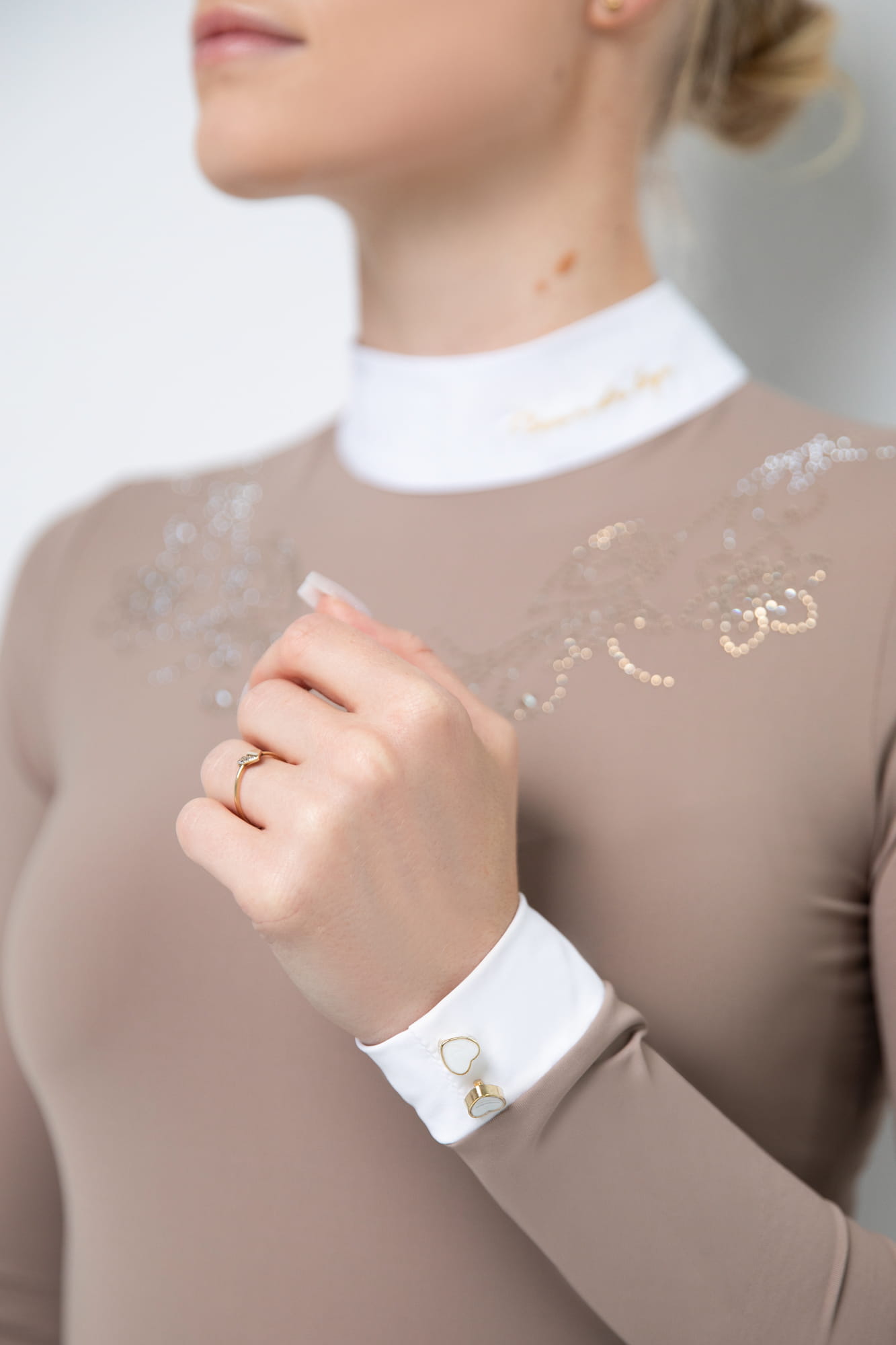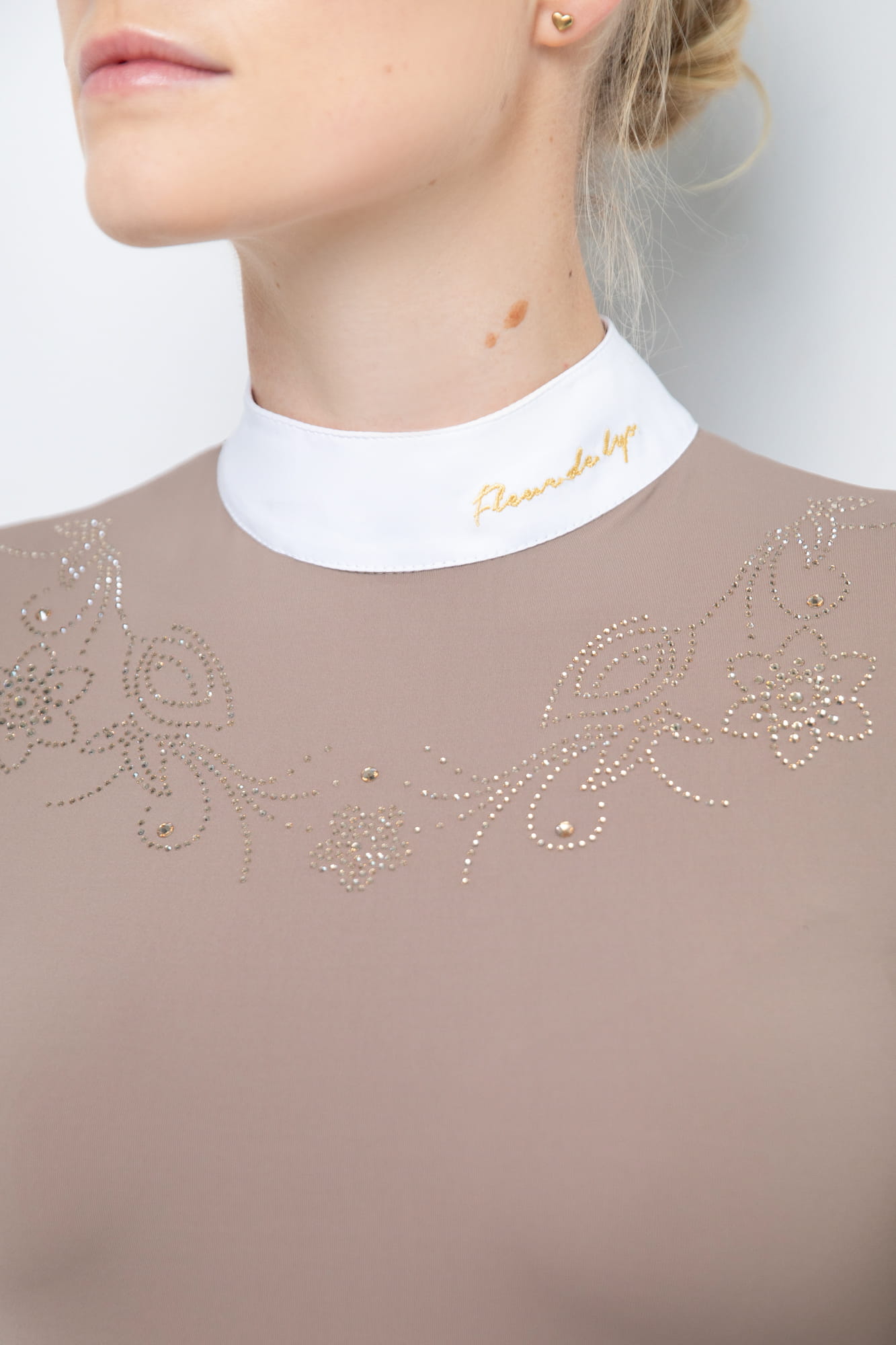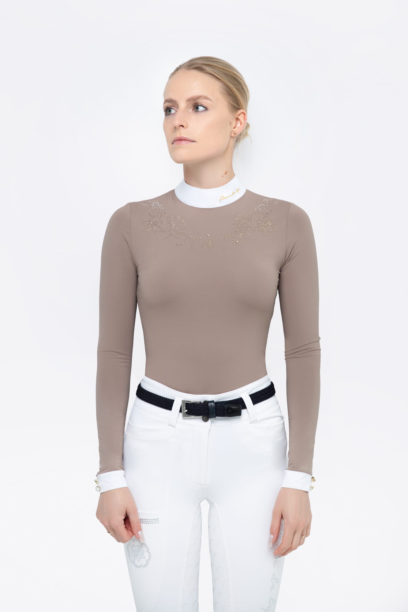 Ladies' long-sleeved Holly competition shirt. Made of top quality material, comfortable, breathable and extremely elastic. Perfectly fitted, emphasizes the figure. This is undoubtedly the most stunning model. Crystals scattered on the shirt guarantee high gloss and a wonderful effect. It has charming flower details on the cuffs and collar. Additionally, the collar is completed with delicate golden embroidery. The shirt is dirt-resistant.