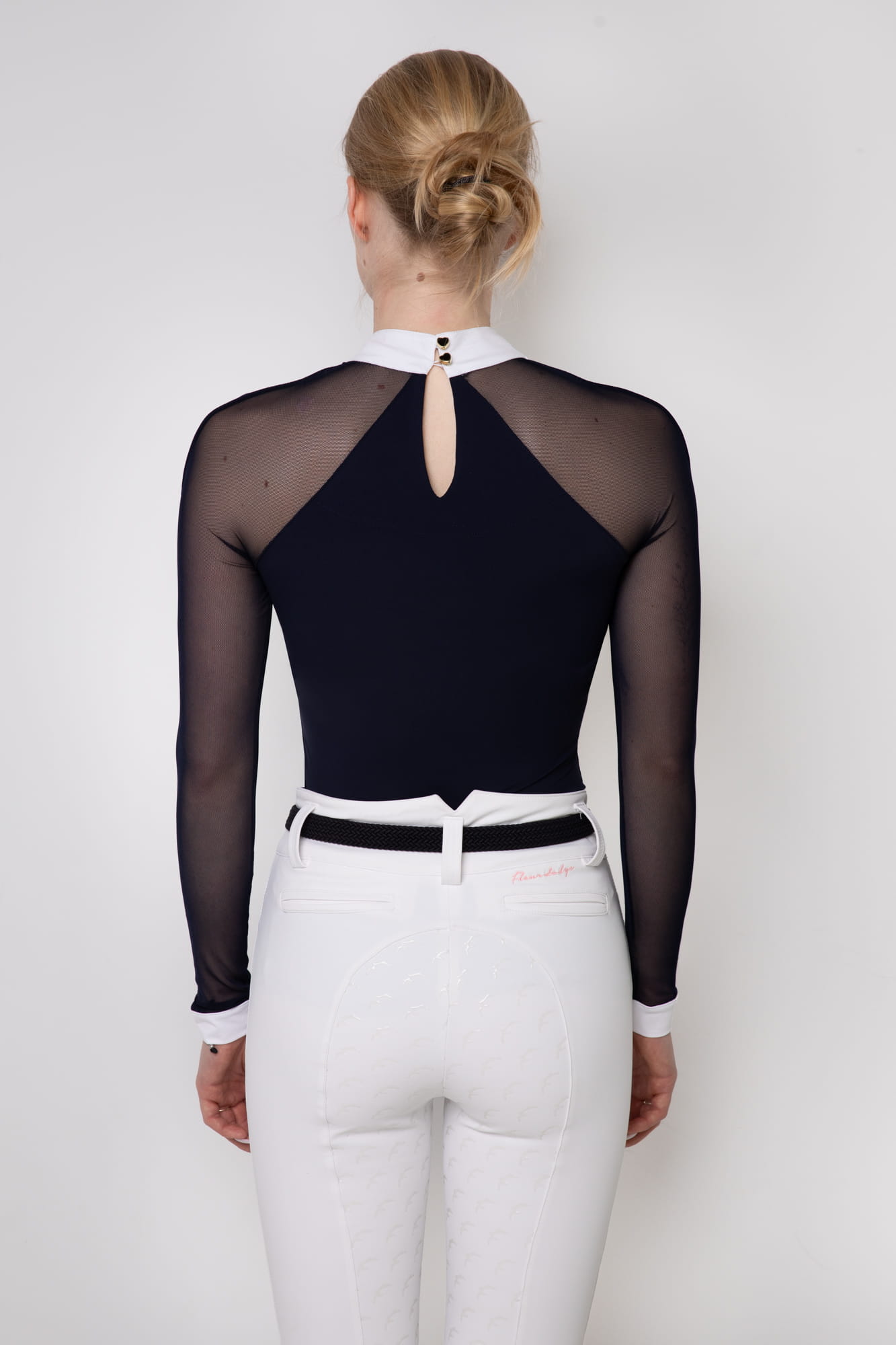 The MOLLY model is made from high-quality, elastic polyamide that fits the body beautifully, enhancing the athletic character of your show look. The upper part features a transparent, elastic mesh panel that ensures maximum breathability and thermal comfort, making this shirt perfect all year round. During the summer season, it provides a lightweight, airy feel, keeping you cool even on the hottest competition days.