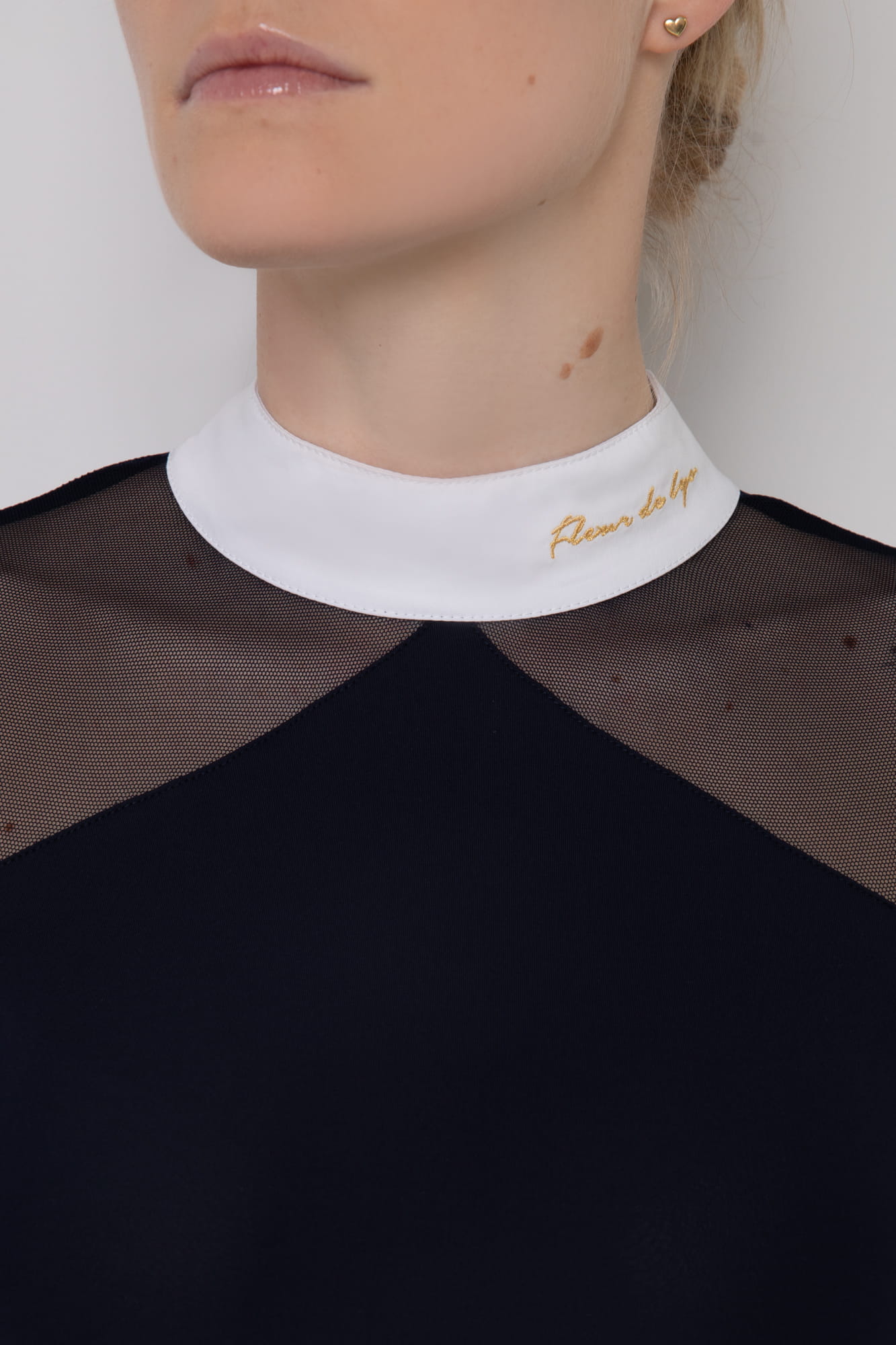 The classic white stand-up collar, adorned with a delicate Fleur de Lys embroidery, meets competition regulations while maintaining a refined, contemporary design. The asymmetric neckline visually elongates the silhouette, giving the shirt a dynamic and elegant expression.