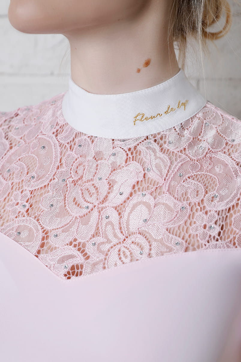 In response to your suggestions, we created a short sleeve version. Made of the best quality sports fabric, comfortable, breathable and extremely elastic. Perfectly tailored, it emphasizes the figure. Sleeves and front made of premium stretch lace, pleasant to the skin. Guarantees comfort during takeoff. It has a delicate scattering of Swarovski crystals hand-glued, extremely shimmering, creating a beautiful effect. The blouse looks phenomenal both under the competition tailcoat and on its own.