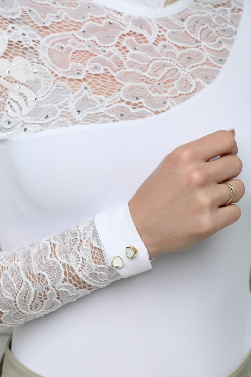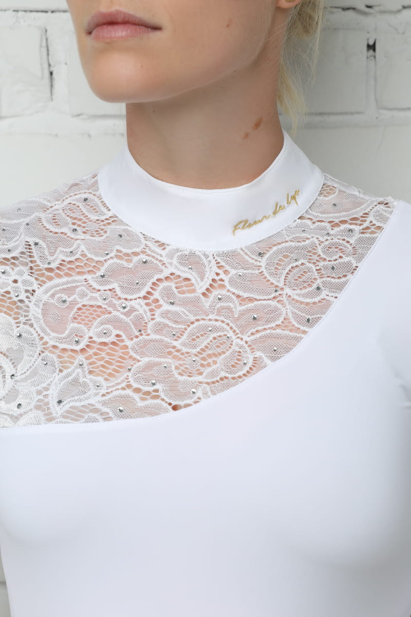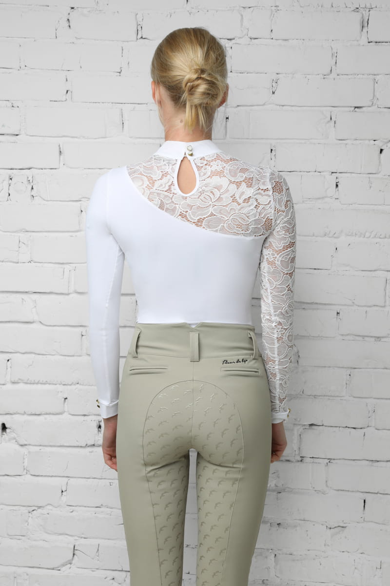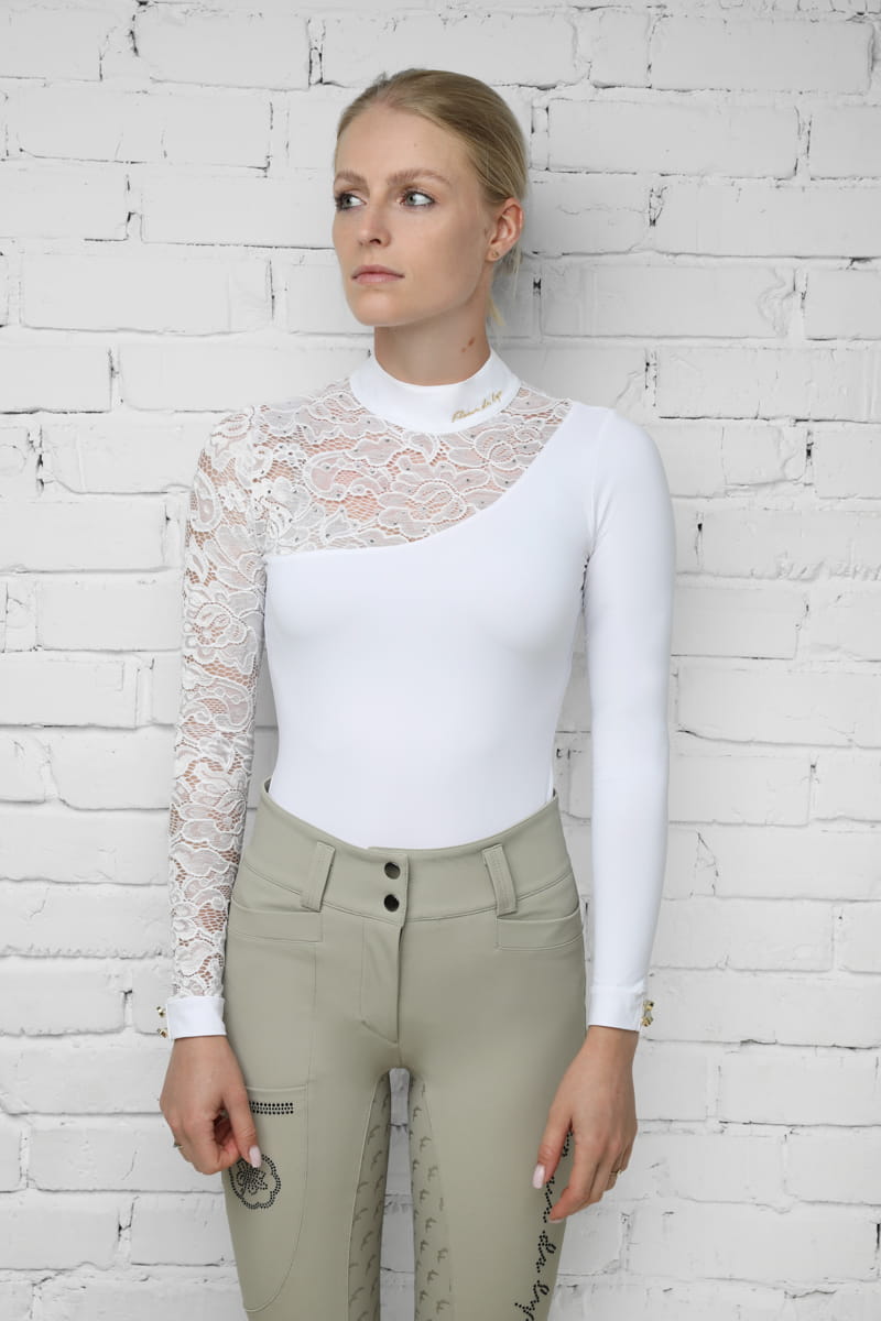 Introducing the Zinnia Shirt, an exquisite blend of elegance and innovation, designed for the discerning equestrian. This stunning shirt features an asymmetrical lace design and hand-applied crystals, combining sophistication with high-performance materials.